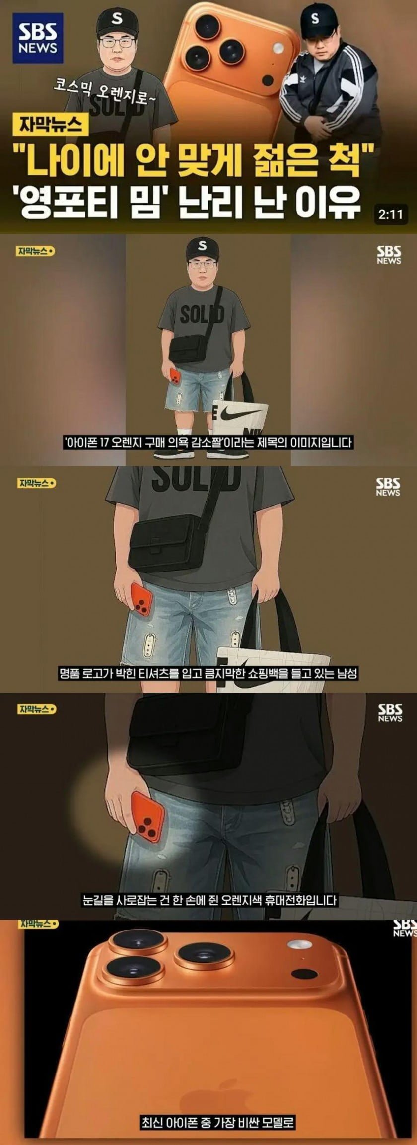 브랜드와 소비 문화에 미치는 파장도 짚어봐야 한다. 명품 로고 티셔츠, 주머니를 채우는 대형 쇼핑백, 한 손에 쥔 ‘오렌지색’ 폰 등은 모두 시각적 신호다. 이는 브랜드가 젊음과 활력을 강화하기 위한 메시지를 강화시키는 동시에, 중년층의 과시적 소비를 정상화시킬 수 있다. 반대로 이런 프레이밍이 중년층 전반을 ‘젊음의 모방자’로 고정시킬 위험도 있다.