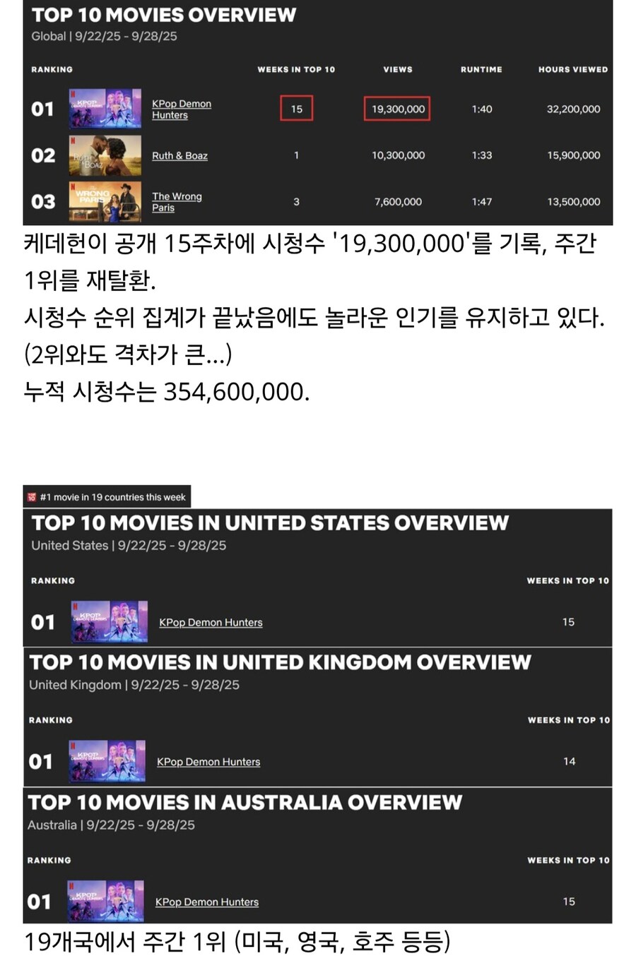 최근 발표된 시청 수 순위 데이터를 보면, 케데헌은 15주차에 다시 1위를 차지했다. 주간 19.3백만 뷰를 기록했고, 누적 시청 수는 3억 5천 4백만 뷰에 이른다. 이러한 연속성은 단발성 흥행이 아니라, 비교적 긴 기간에 걸친 꾸준한 인기를 시사한다. 특히 글로벌 19개국에서 1위를 기록했다는 점은 국경을 넘는 매력의 힘이 작용했음을 암시한다.