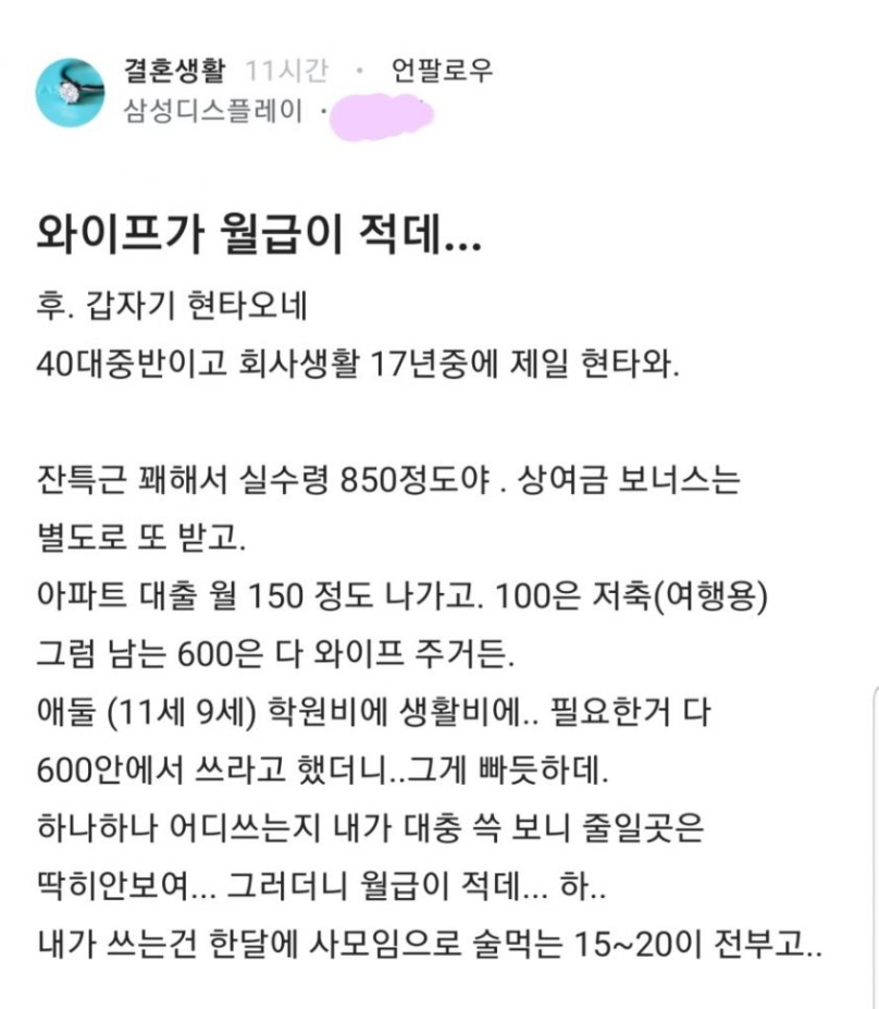 요즘 현실 속에서 한 가정의 월급 명세를 들여다보면 숫자 너머의 이야기가 보인다. 40대 중반에 회사에서 17년 차로 버틴 남성이 매달 실수령 850정도에 불과하고, 아파트 대출 150과 저축 100 사이에서 균형을 맞추려 애쓴다.