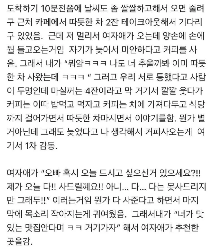 이 대목은 현대 데이트의 이중주를 드러낸다. 경제적 부담이 관계의 진정성이나 애정의 크기를 결정하지 않는다는 점을 상시 확인해야 한다. 다만 누가 언제 결제하는가가 대화의 힘의 균형을 암시하곤 한다.