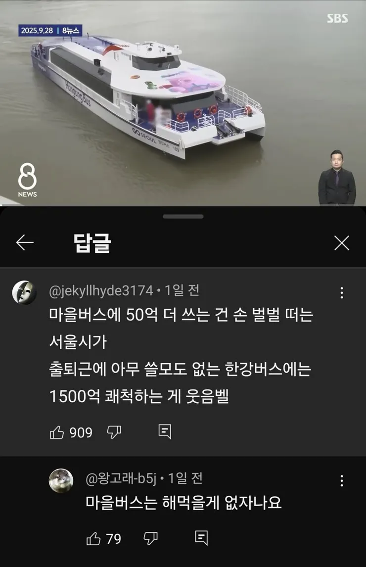 보도에 따르면 서울시는 마을버스에 더 많은 예산을 투입하는 반면, 한강버스에는 1500억에 이르는 큰 금액이 책정됐다 한다. 같은 도시, 같은 버스 체계에서 우선순위가 이렇게 다를 수 있다는 사실이 먼저 눈에 띈다.