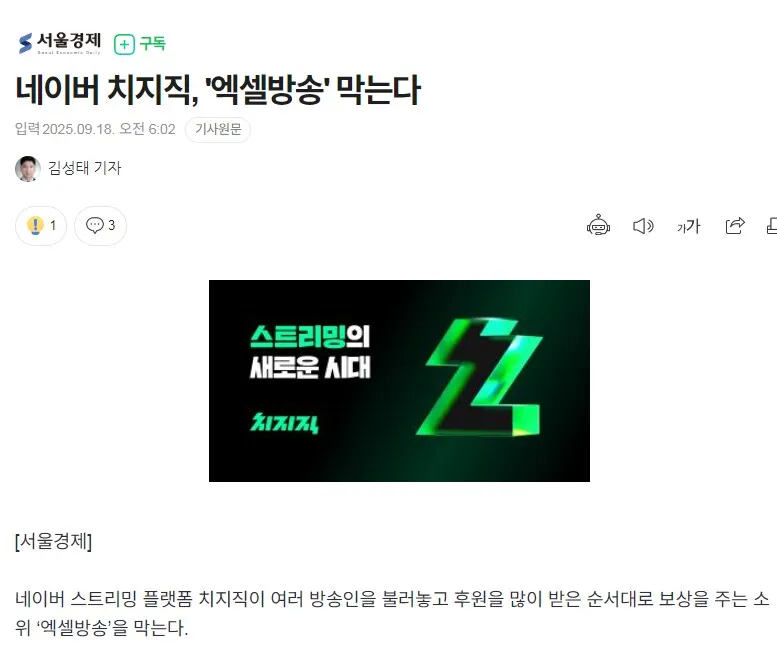 요즘 네이버의 스트리밍 생태계에서 ‘치지직’이란 플랫폼이 이슈의 중심에 섰다. 여러 방송인을 한 자리에 모아놓고, 후원 규모에 따라 보상을 나눠 주는 이른바 엑셀방송을 막겠다는 결정이 나오면서, 그 배경과 함의에 대한 이야기가 이어진다.
