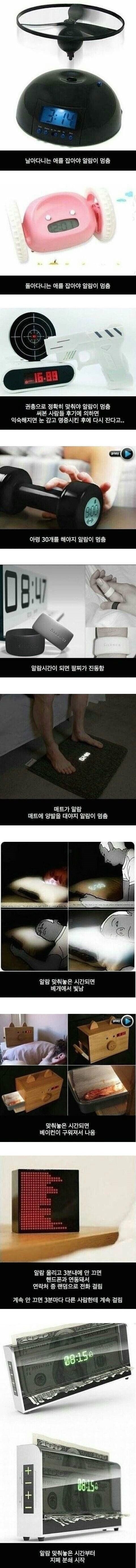 오늘의 알람은 옛날 벨 소리에서 벗어나 더욱 강하게 우리를 깨우려 한다. 팔찌의 진동, 마사지 매트의 양발 인식, 베개에서 빛이 퍼지는 현상 같은 다양한 연출이 등장했고, 때론 베이컨 냄새까지 활용된다. 심지어 3분 내 끄지 않으면 랜덤으로 전화가 걸려오는 시스템도 보인다.