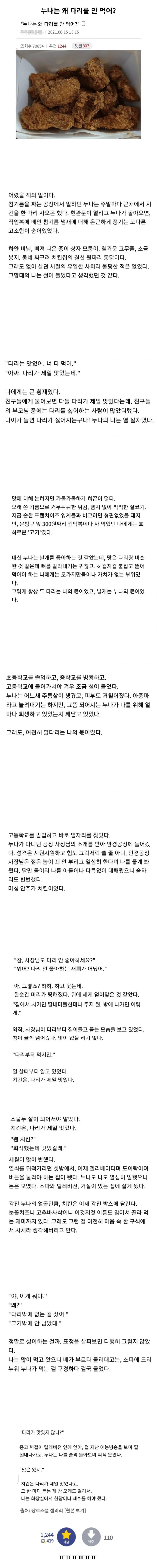 누나가 닭다리를 먹지 않는 이유를 다룬 짧은 기사 한 조각이 오늘의 시사 해설로 다가온다. 참기름 냄새가 배인 작업복과 싸구려 치킨의 기억은, 우리의 식탁이 단순한 선택의 공간이 아니라 가족의 이야기가 겹겹이 쌓인 곳임을 상기시킨다.