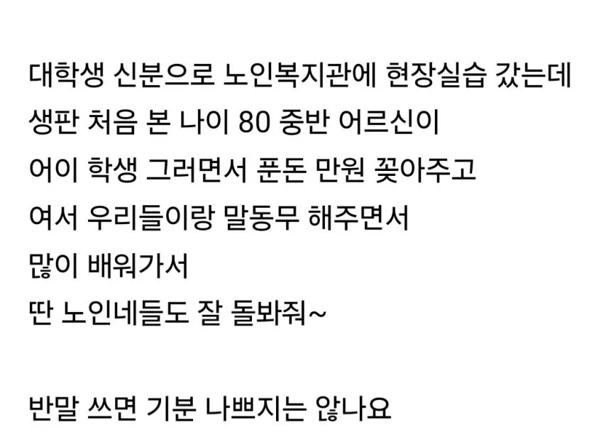 초면에 반말이 오가던 현장은 언어가 관계를 만드는 힘을 직면하게 한다. 노인복지관에서 현장실습을 하던 대학생의 이야기는, 어르신이 반말로 말하고 푼돈을 건네며 말동무를 해주는 모습 속에 친밀함과 경계가 동시에 얽혀 있음을 보여준다.