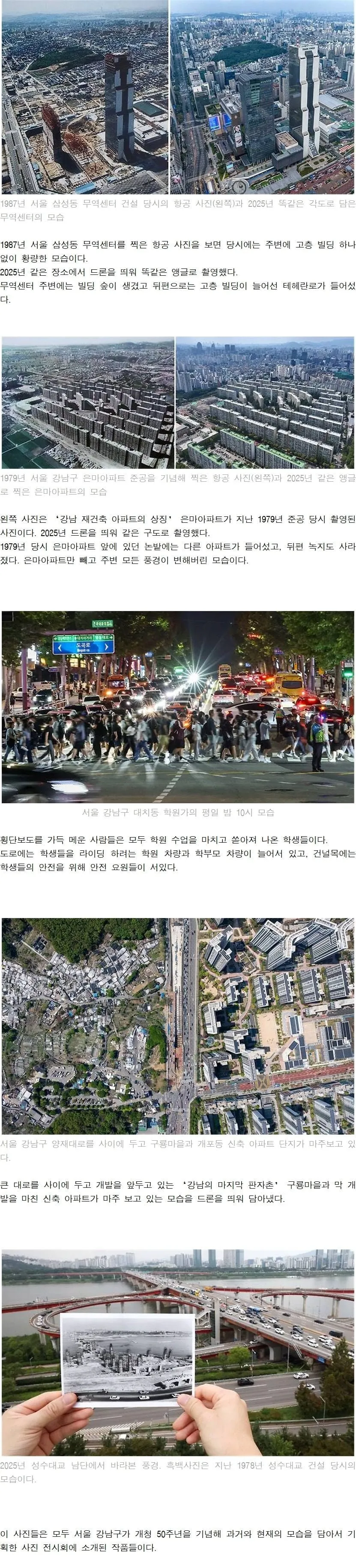 1987년, 삼성동 무역센터를 바라보던 첫 인상은 황량함 그 자체였다. 같은 각도에서 2025년을 찍은 현재의 풍경은 빌딩 숲과 반짝이는 테헤란로로 도시의 실루엣을 바꿔 놓았다. 이 변화는 높이의 대담함만이 아니라, 사람들의 하루를 재배치하는 방식의 변화를 말해 준다.