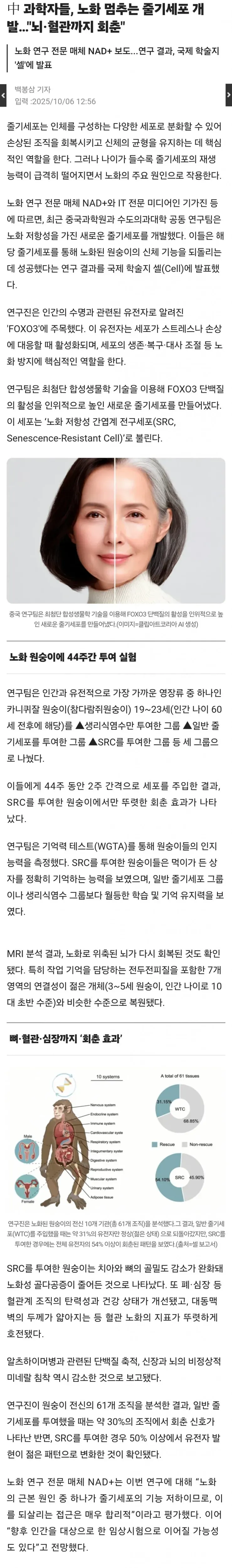 마음이 바빠 출근길에 커피 한 잔의 여유를 찾듯, 이 노화 관련 소식은 우리를 또 한 번 ‘가능성의 카페’로 이끈다. 중국 연구팀이 줄기세포로 노화를 멈추고 뇌 혈관까지 되살릴 수 있다며 국제 학술지에 발표했다고 하지만, 헤드라인의 자극이 과장됐을 가능성도 남아 있다.
