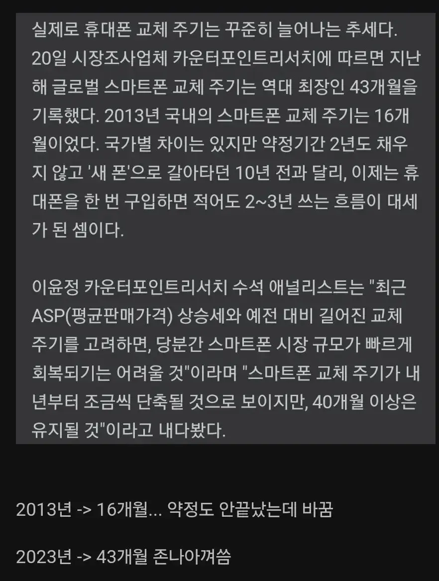 요즘 핸드폰 교체 주기가 왜 이렇게 늘었는지, 사실은 우리 일상과도 맞닿아 있는 변화의 이야기다. 글로벌 평균이 43개월로 역대 최장치를 기록했다니, 한두 달의 차이가 아니라 거의 3년 가까이 쓰는 사람들이 많아진 셈이다.