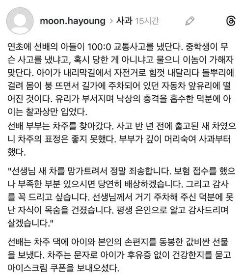 사고의 주인공은 선배의 아들이었다고 들리지만, 현실은 늘 그런 식으로 가볍게 흘러가지 않는다. 차주 가족은 진심으로 사과를 전했고, 보험 접수를 했으나 부족한 부분이 있다면 배상하겠다며 여지를 남겼다. 그리고 선배 부모는 아이와 본인의 손편지를 담아 값비싼 선물을 보내며 관계를 다독였다. 차주는 문자로 아이의 안부를 묻고 아이스크림 쿠폰까지 보내며 분위기를 마무리했다.