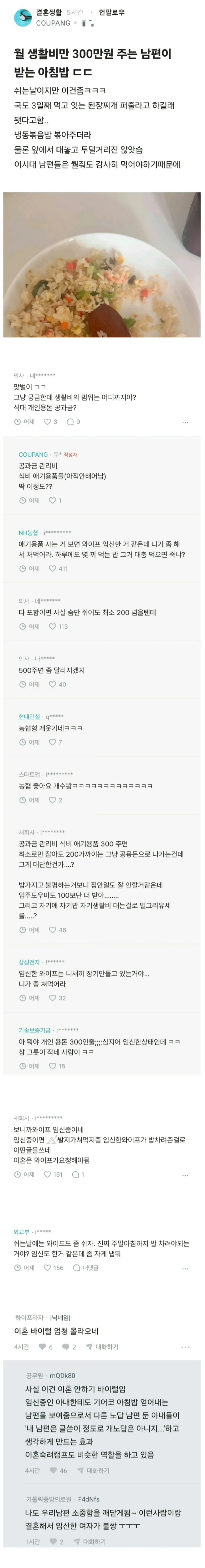 월 생활비만 300만원 주는 남편이 받는 아침밥