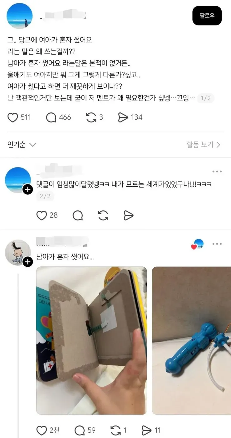 근거 없이 이야길 만들면 안 되니, 배경부터 상상해본다. 남아가 혼자 썼어요가 팔리지 않는다는 가정은 어디서 나온 걸까? 아마도 판매자 입장에서는 '여아 혼자 썼어요'라는 문구가 더 다정하고 안전한 분위기를 만들어 매력 포인트가 된다는 해석이 작용했을 수 있다. 혹은 혹시 알고리즘이 특정 표기를 선호하는 걸까, 판매노출이 조금이라도 유리하다고 느끼는 순간 말이지.