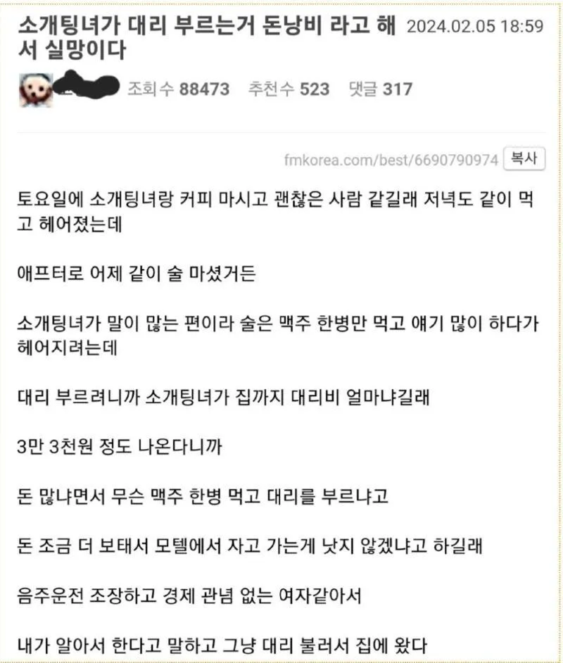 요즘 데이트의 핫 키워드 중 하나가 바로 대리비다. 오늘도 가볍게 웃고 넘길 만한 소문이 SNS를 스치고 지나갔다. 한 소개팅 자리에서 벌어진 작은 대화가, 돈과 책임의 경계까지 건드리는 분위기를 만들어버렸으니 말이다. 이건 단순한 비용 이야기가 아니라, 우리 사이의 가치관 시험 같은 느낌이었다.