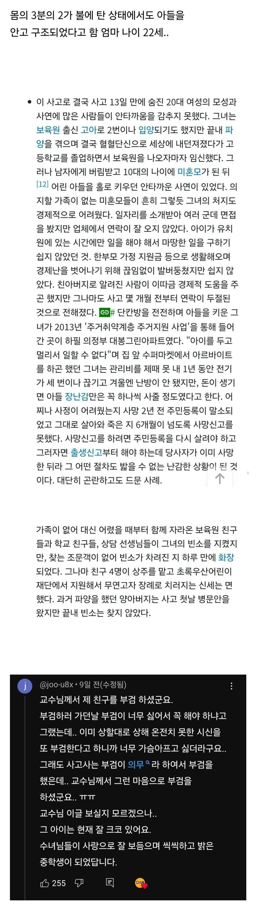 그 주인공은 보육원에서 자라 두 번의 입양과 두 번의 파양을 겪었다고 들려온다. 아이를 품고 살았던 날들의 수고는 경제적 어려움과 맞물려 그녀를 점점 더 낡은 공간으로 밀어넣었다고 한다. 주거 취약 문제와 맞물린 현실이 하루하루를 좌지우지했고, 제도적 도움의 간극은 여전히 커 보였다.