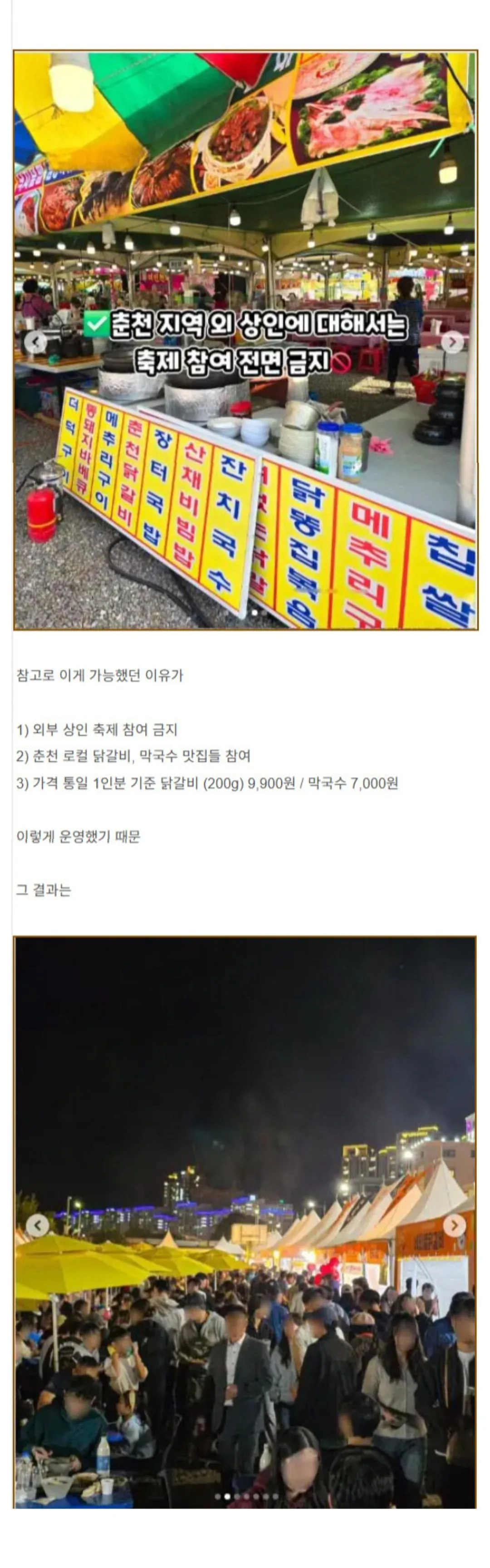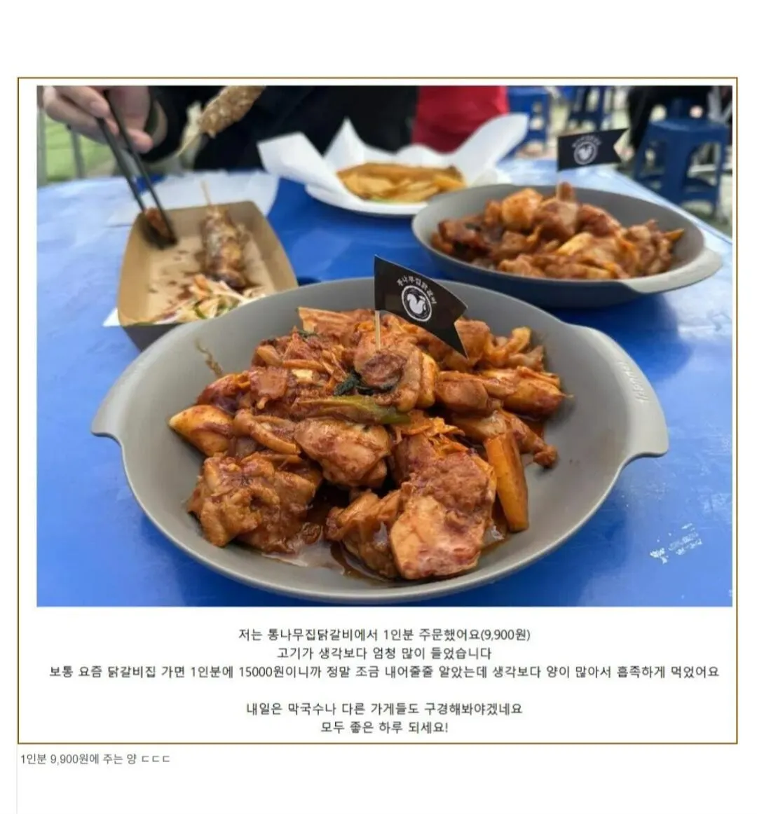 배경은 생각보다 간단했어요. 외부 상인 축제 참여 금지라는 규칙 아래, 춘천 로컬 닭갈비 맛집들이 축제의 주축이 되었고 막국수 같은 사이드도 일정하게 묶여 팔리는 구조였죠. 200g에 9,900원으로 맞춘 덕분에 가격의 통일성은 확실했고, 사람들은 '양은 충분하고 가격은 예측 가능하다'는 말에 안심하는 듯했습니다. 혹시 이것이 지역 상인들의 협상력과 소비자의 기대를 동시에 관리하는 작은 퍼포먼스였을까요?