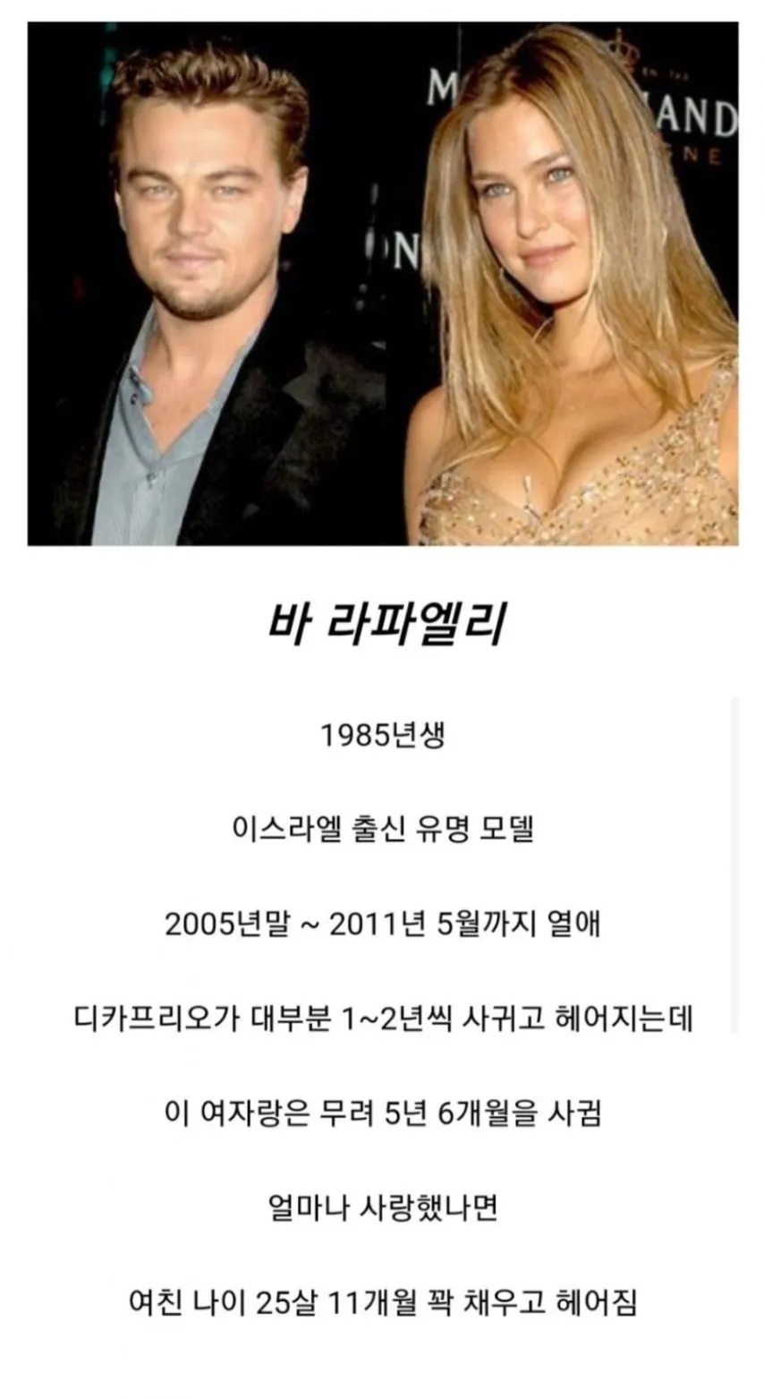요즘 핫한 의문 중 하나, 디카프리오의 가장 사랑하는 여자친구가 누구였을까? 발췌 자료의 단서들을 모아보면, 그 주인공은 이스라엘 출신 모델 바 라파엘리로 보인다. 두 사람은 2005년 말부터 2011년 5월까지 열애했다는 루머가 대중의 기억에 남아 있다. 이 글은 그 단서를 엮어 왜 이 커플이 오랜 기간 회자될 수밖에 없었는지, 맥락을 상상해 설명해 본다.