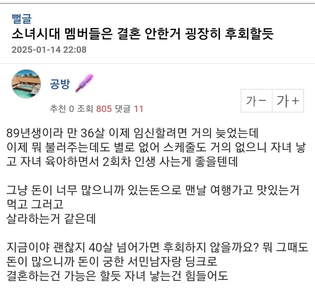 소녀시대 멤버들은 결혼 안한 거 굉장히 후회할듯
