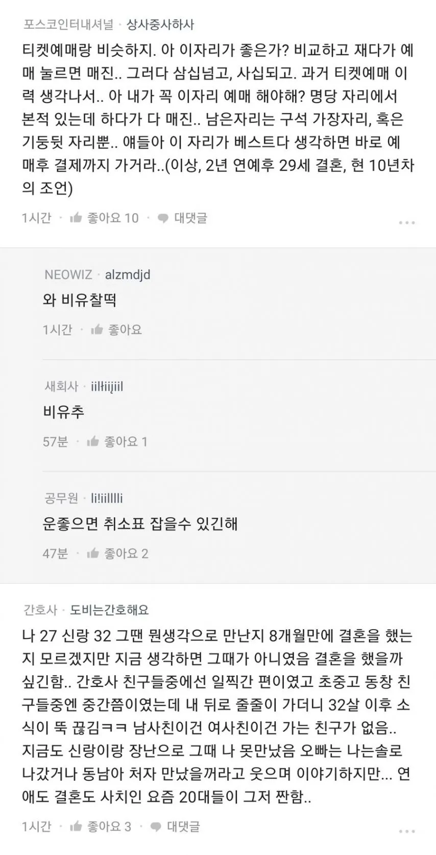 배경은 복잡하다. 어떤 글은 결혼을 '티켓 예매'에 비유하는데, 원하는 자리가 떠나면 매진되는 느낌이라고 한다. 남자든 여자든 피크 타임이 다르고, 그 시점은 사람마다 다르다. 그래서 '지금이 기회다' 같은 문구가 주변에 자주 걸려 있다. 이 흐름은 하나의 그림으로 축약되기보다, 여러 색의 실타래처럼 엮여 버린다. 그래서 묻게 된다: 이 타임라인이 정말 각자의 인생에 맞는 걸까?