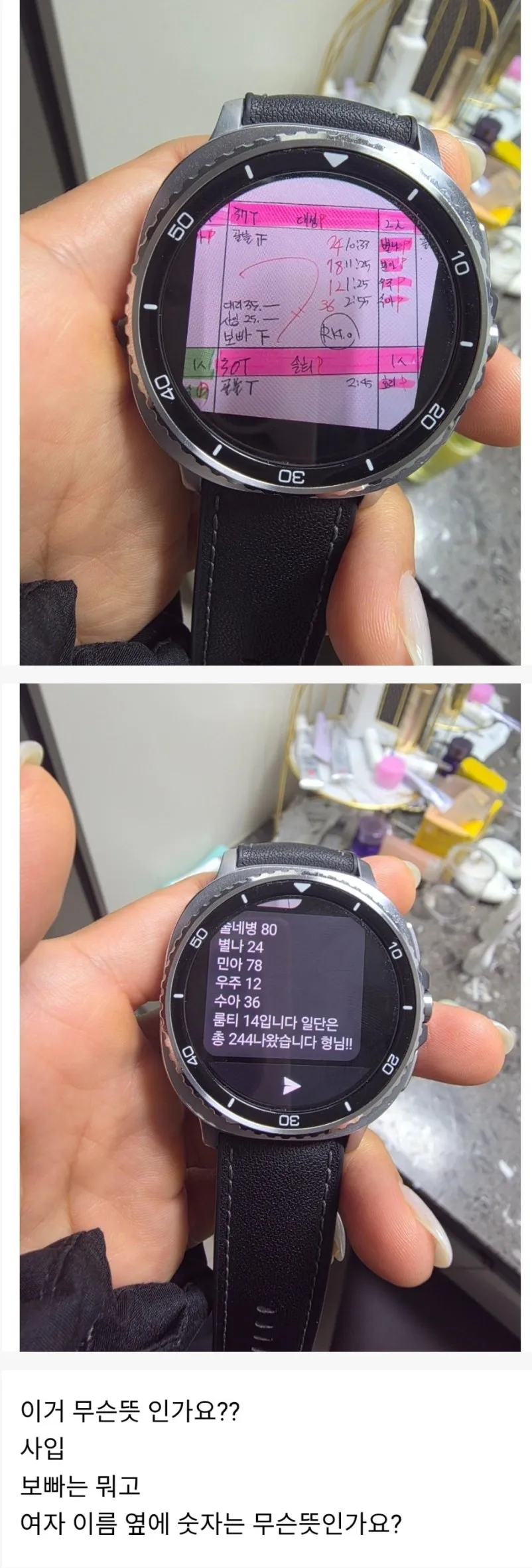 배경은 생각보다 훨씬 더 촘촘합니다. 표면의 숫자와 이름은 무언가를 숨기는 코드 같아 보이죠. 대리 35-, 대성 24:10:33, 별나 18:11:25 같은 조합은 어쩌면 이름-시간-다음 순번의 삼중 코드일 수 있습니다. 보빠 F, 룸티 14, 솔희? 같은 낱말들이 툭툭 튀어나오는 걸 보니, 게다가 '사입'이나 '사임' 같은 단어가 등장하는 걸 보면, 이건 거래나 변화의 신호일 수도 있겠네요.