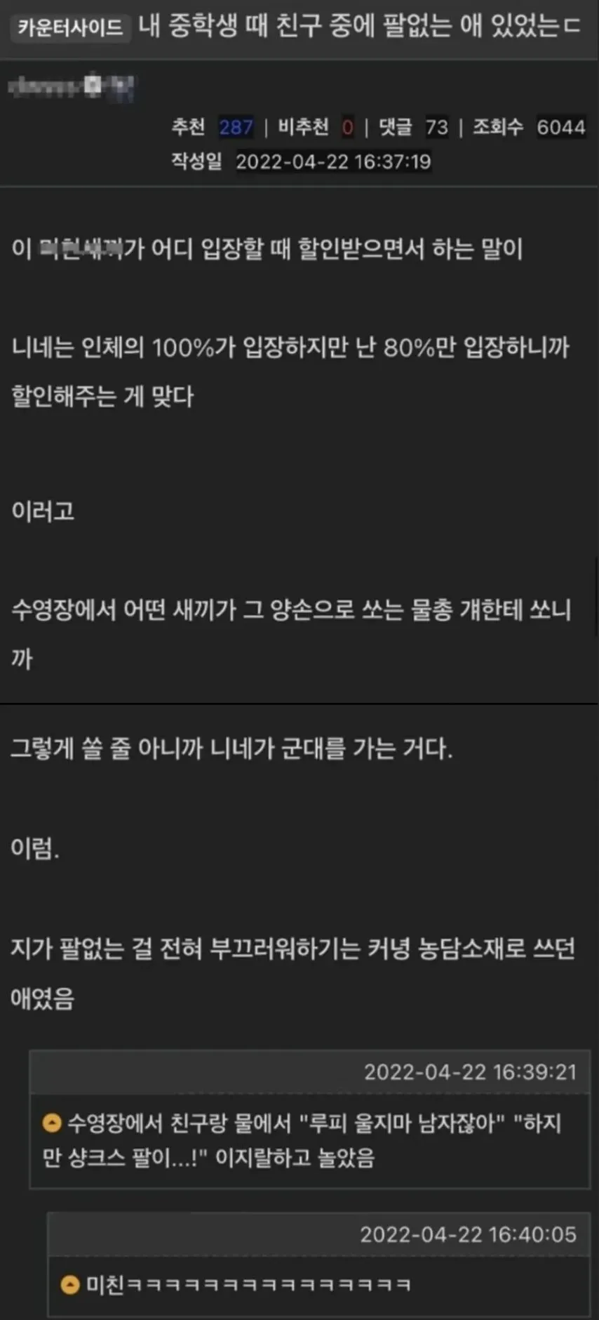 결론은 아직 없다. 팔 없는 친구의 에피소드는 우리 마음속의 경계와 농담의 선을 시험하는 미세한 지문처럼 남아 있다. 카운터사이드에서의 대화가 지나친 농담으로 흘러보내진 순간도 있었고, 서로의 상처를 더 깊게 새길 수도 있었다. 결국 이 이야기가 남기는 것은, 읽는 이의 시선이 어디에 쏠리는가일 뿐, 단정은 금물이라는 점일지도 모른다.