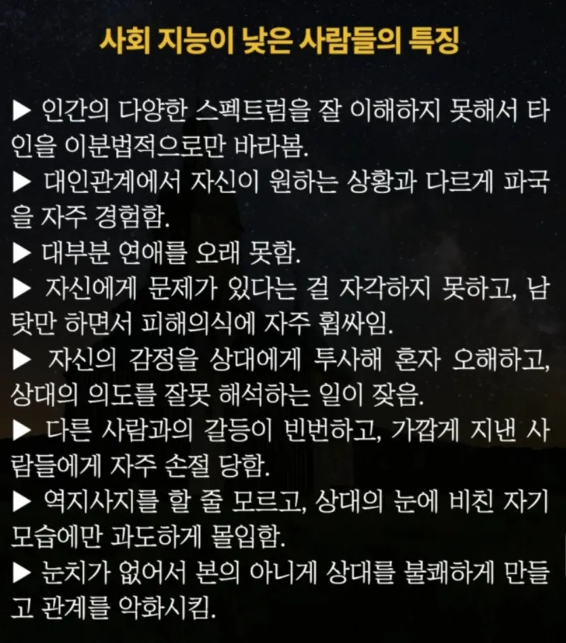 배경을 들여다보면, 사회적 지능이 낮은 사람들의 특징으로 보이는 것들이 여럿 있어요: 상황의 큰 그림을 놓치고, 사소한 것에 매달리며, 잘못된 정보에 흔들리는 편향. 이들은 감정 투사나 남 탓으로 관계의 방향을 바꿔버리기도 하죠. 이런 패턴은 연애나 친구 관계에서 파국으로 이어지는 경우가 많다고 해요.