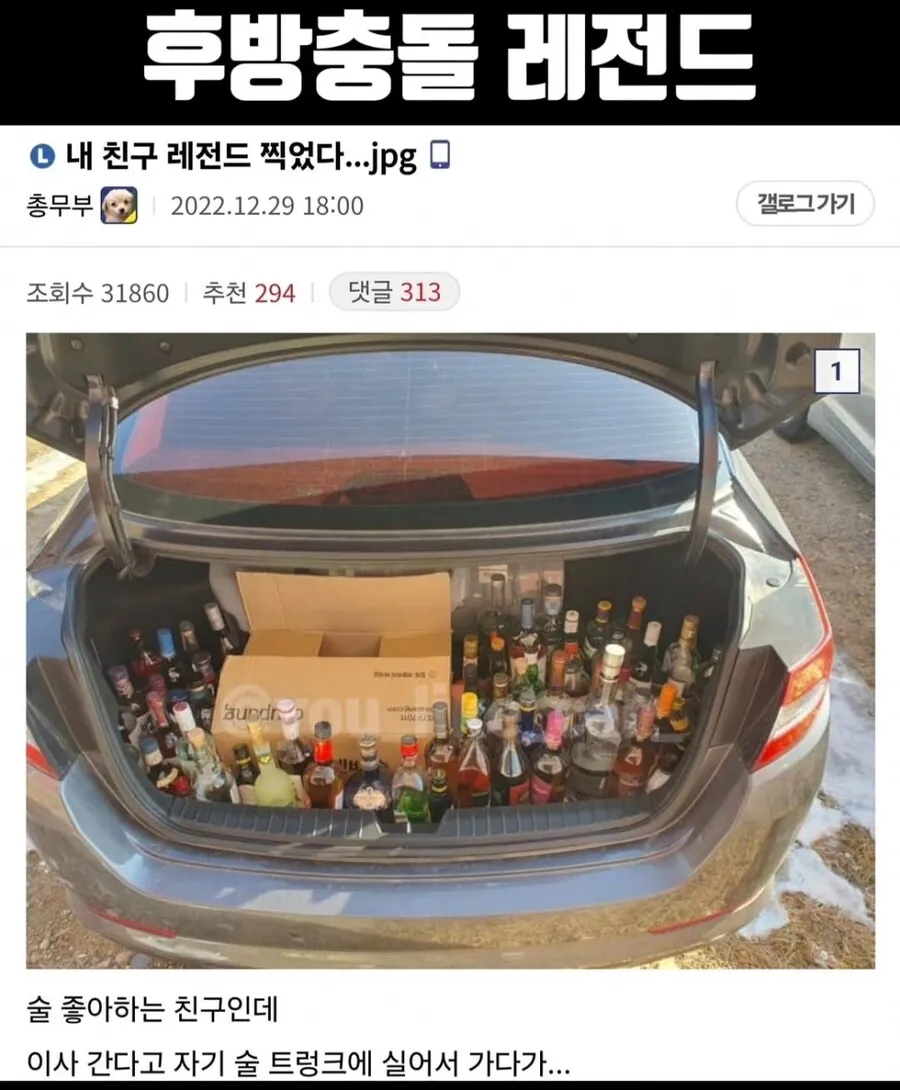 술을 좋아하는 친구가 이사 가느라 자기 차 트렁크에 술을 실었다는데, 그 상태로 무언가가 크게 잘못되었다는 뒷담이 번졌다.