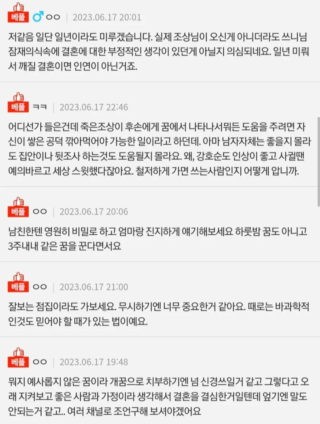 다양한 해석이 가능하지만, 가장 중요한 건 각자 마음속에서 어떤 의미를 찾느냐입니다. 꿈이 말해주는 건 선명한 확신이 아니라, 현재의 불안과 가치관의 충돌일 때가 많으니까요. 누가 옳다고 단정하기보단, 두 사람의 소통과 가족의 분위기를 천천히 가볍게 살펴보는 게 좋지 않을까요? 이 이야기가 우리에게 남기는 여운은, ‘미래를 예민하게 읽는 습관’일지도 모릅니다.