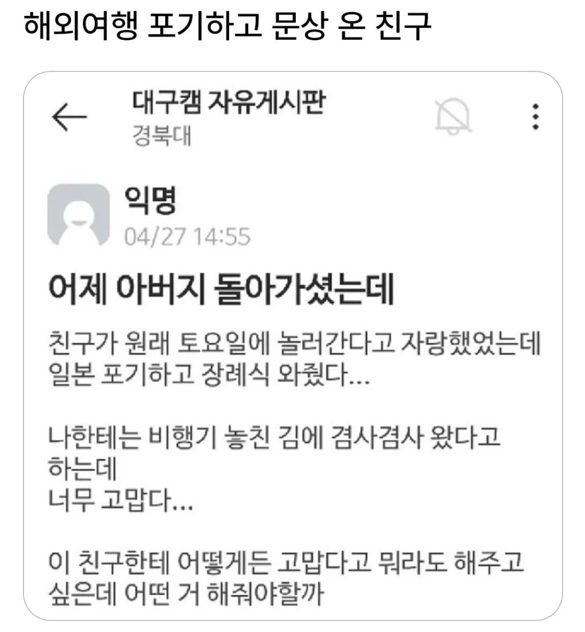 요즘 같은 대학가 커뮤니티에서 가장 자극적인 소문은 언제나 '진짜 친한 친구'의 그림자 같은 선택이다. 해외여행을 포기하고 문상으로 달려온 한 친구의 이야기가 훈훈함을 넘어 의문까지 남겼다. 경북대 학생 커뮤니티에 떠도는 이 사례는, 한 사람이 내린 선택이 또 다른 사람의 하루를 어떻게 바꿔 놓는지 말해준다. 비행기표를 바꿔 급히 발걸음을 재촉해 온 그 친구의 행보, 도대체 어떤 의미일까?