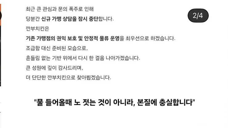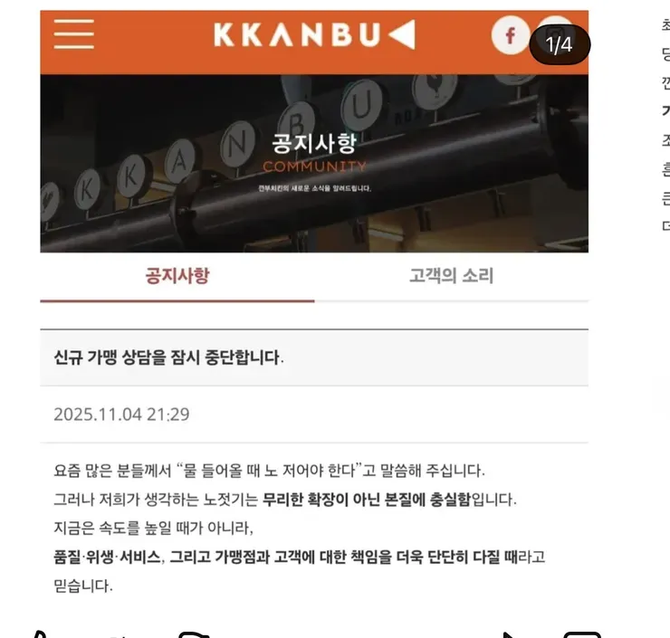 깐부치킨이 또다시 커뮤니티 핫 이슈로 떠올랐어요. 최근 올라온 공지에는 신규 가맹 상담을 잠시 중단하겠다며, 기존 가맹점의 권익 보호와 물류의 안정성을 우선하겠다는 의도가 담겨 있습니다. 속도보다는 품질과 신뢰를 먼저 다지겠다는 메시지가 들리죠. 이 결정이 앞으로의 흐름을 어떻게 바꿀지, 아직은 우리도 모르는 구석이 많답니다.