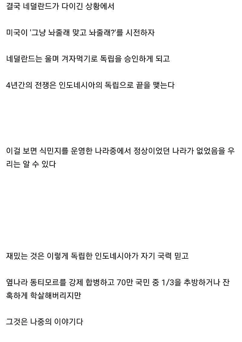 전쟁이 막바지에 이르자, 네덜란드는 독립을 인정받고도 재관의 눈치를 보며 동남아의 바람을 억누르려 했고, 현지 민심은 그에 맞섰습니다. 인도네시아의 독립은 국제 질서의 한 축으로 읽히기도 했고, 여러 해석이 남아 있습니다. 그리고 동티모르의 사태처럼, 식민지의 그림자는 시간이 지나도 쉽게 잊히지 않죠. 이 모든 흐름은 오늘의 국제정치에도 여운으로 남아 있습니다.