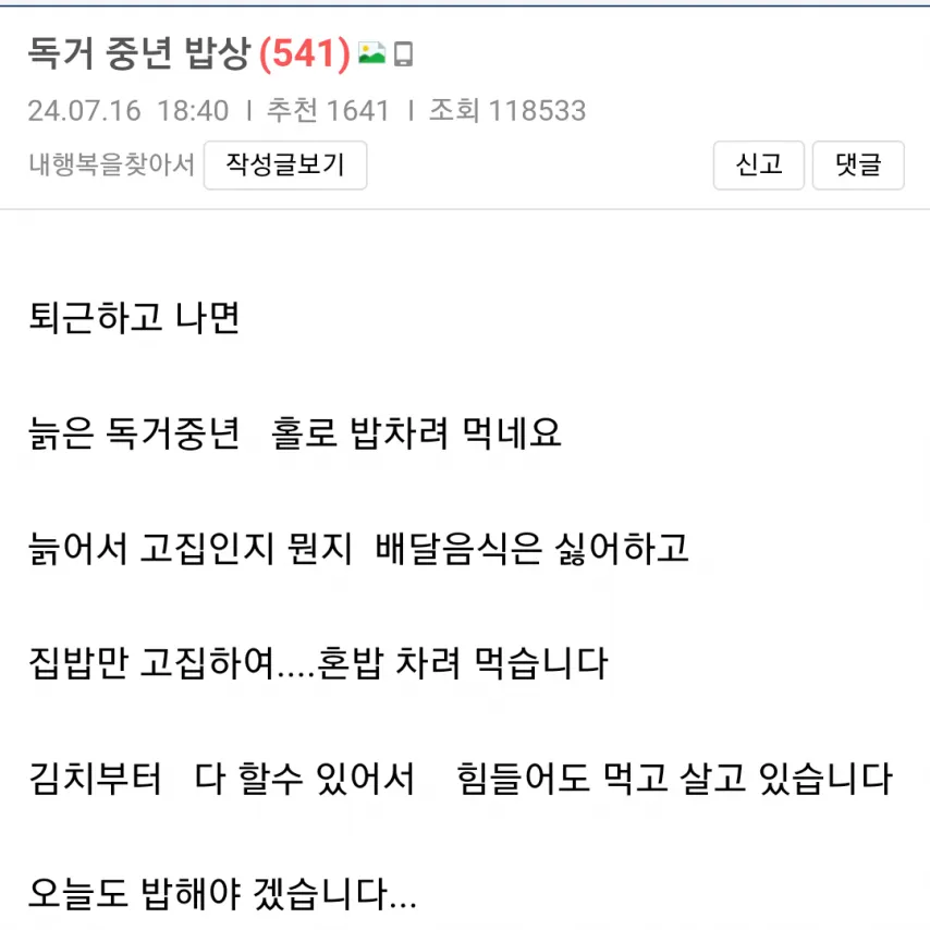 독거 중년의 밥상 같은 소식이 온라인에 떠올랐다. 독거 중년, 집밥, 혼밥 같은 키워드가 조용히 떠오르며 한 사람의 밤샘 주방 의식이 이렇게 이야기를 낳을 줄 누가 알았을까. 사진이나 원문 없이도 우리를 끌어당기는 이 작은 밥상은 무엇을 말하려는 걸까, 호기심이 먼저다.