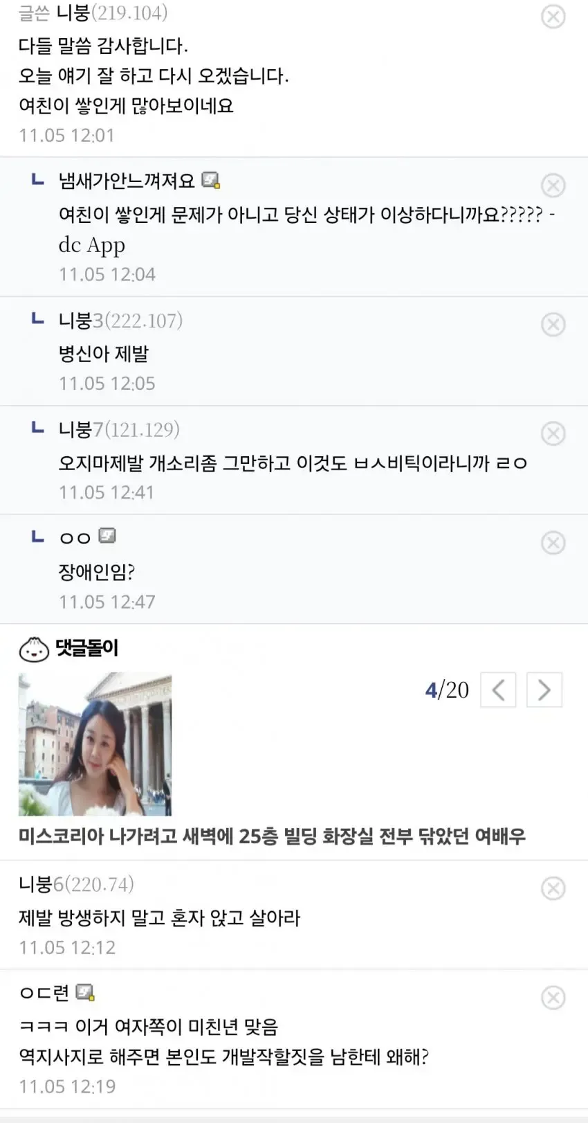 배경을 덧대면 이래저래 말들이 분주하다. 술에 취한 남친이 집에 들어와 보니 여친은 뭔가를 정리하느라 바빴고, 물건을 던졌다는 소문도 있었다고 한다. 그리고 현금 100만 원 정도의 자잘한 자취까지 거짓말 같지 않게 흘러나온다는 뒷소문이 있다. 이건 단순한 다툼의 흔적으로 보이기엔 무겁고, 누가 먼저였는지 여부를 떠나 관계의 경계를 시험하는 사건으로 보이기도 한다.