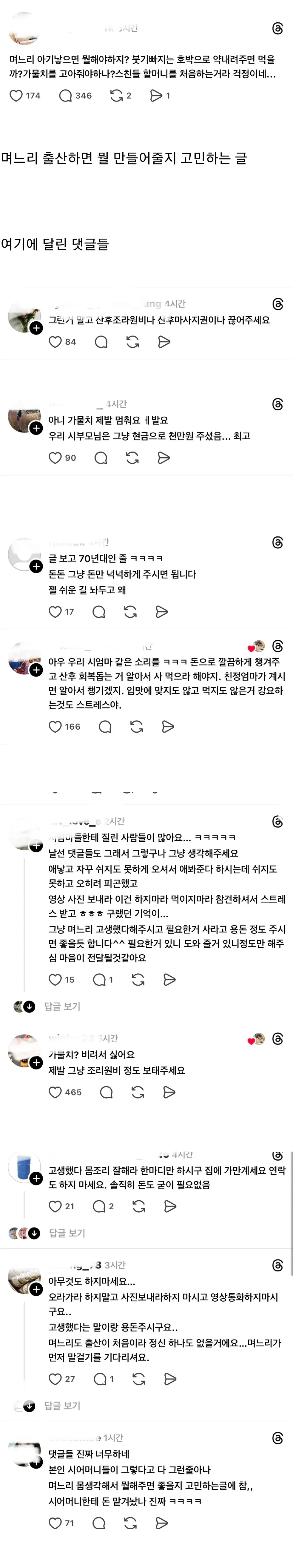 배경은 의외로 단순하다. 며느리가 아기를 낳고 나면 뭘 해주면 좋을지에 대한 질문에서 시작된 이 글은, 시어머니와의 솜씨 대결로 번져 간다. 호박즙이 도움이 될지, 가물치가 맛없다는 말이 상징하는 바가 무엇인지가 논의의 핵심으로 자리 잡았다. 댓글에는 산후조리원 비용, 현금 선물, 그리고 '그냥 돈으로 해결하자' 같은 제안이 거침없이 흘러갔다. 서로의 욕망은 달라도, 마음의 편안함을 주는 방식이 과연 무엇일지에 대한 합의는 아직 도달하지 않았다.