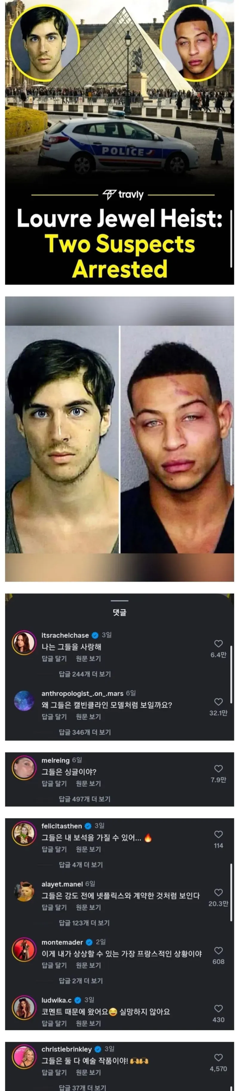 두 용의자 얼굴이 공개되었다는 소식에 SNS 반응이 폭발했다. 잘생겨서 반응이 열광적다는 농담이 퍼지고, 어느새 패션 레퍼런스까지 등장한다. Calvin Klein 모델처럼 보인다는 추측이 떠돌고 그림 같은 사진이 단서처럼 확산된다. 이때의 분위기는 기사와는 다른 팬덤과 탐정 놀이가 섞인 온라인 쇼케이스 같다.