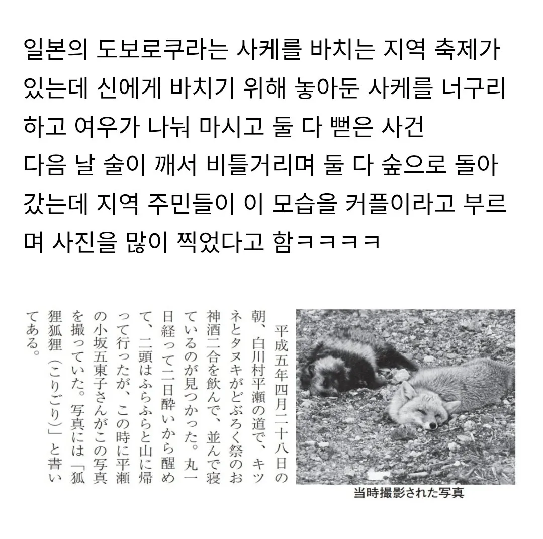 사케 축제, 그리고 도보로쿠라는 이름이 붙은 작은 마을 축제가 만나면 늘 이야기가 시작된다. 축제는 신에게 바치기 위해 남겨둔 세 잔의 사케를 두고 사람들이 모여드는 전통이니까. 그런데 1993년 4월 5일 아침, 도보로쿠의 골목에서 너구리와 여우가 쓰러진 채 발견됐다. 두 동물이 세 잔의 사케를 나눠 마신 듯한 흔적이 남아 있었고, 현지 주민들은 이들을 '커플'이라 부르며 사진을 남겼다.