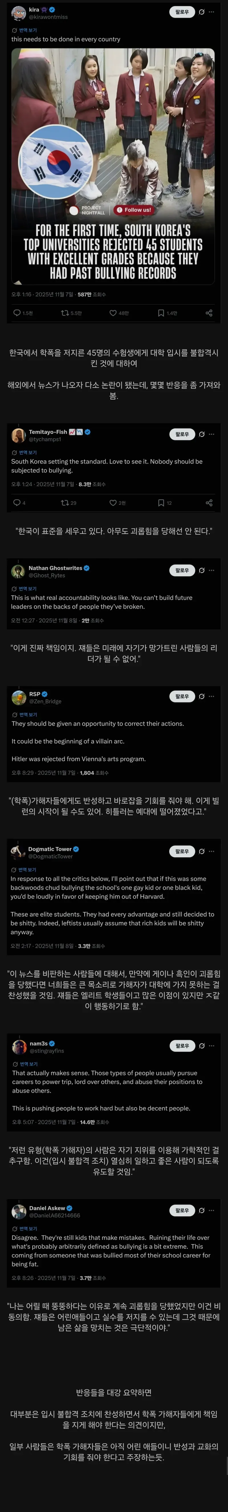 해외에서 논란이라는 한국의 학폭 가해자 입시 불합격 뉴스