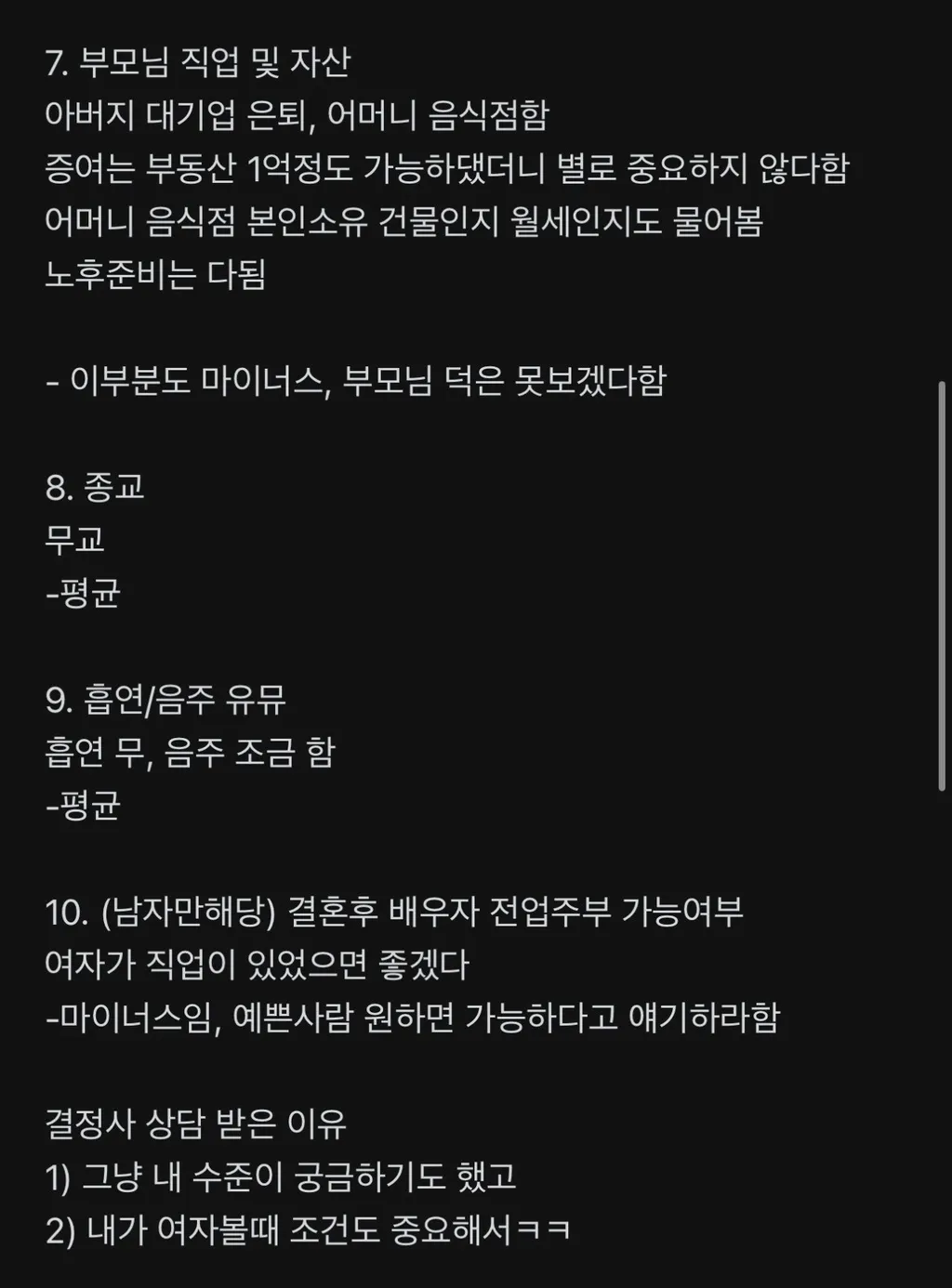 결정사 상담을 받으러 온 이유도 여럿이다. '내 수준이 궁금해서'라는 솔직한 자기고백과, '여자 볼 때 조건도 중요하다'는 다짐이 뒤섞여 있다. 기록엔 무교, 흡연 무, 음주 조금 같은 디테일도 있다. 이 모든 조건이 실제 관계에서 얼마나 잘 살아갈 수 있을지, 한 번쯤은 생각해보게 된다.