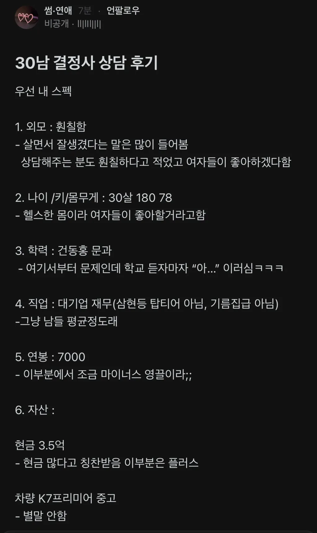 그의 스펙 표가 한 문장으로 묶여 나와 있다. 외모는 '훤칠함', 키 180에 몸무게 78, 학력은 '건동홍 문과'라 적혀 있다. 직업은 대기업 재무로, 특별히 톱티어는 아니지만 안정성은 그럴듯하다. 연봉 7000에 현금 3.5억이라는 숫자는 여유를 뿜어내지만, 자산의 흐름은 부모님의 직업과 이야기에 묶여 있다.