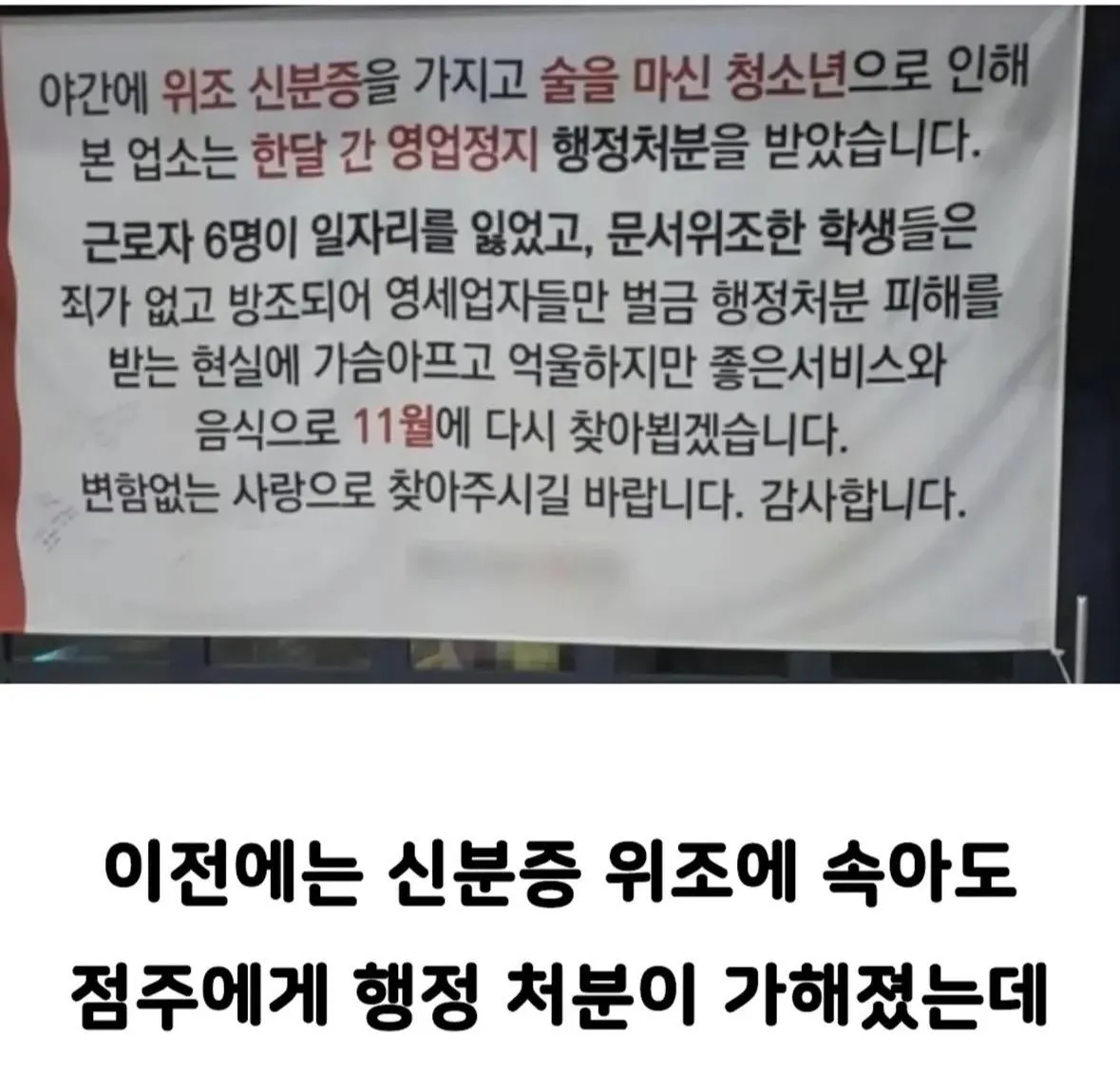 그 흐름은 곧 긴장으로 바뀌었어요. 주인은 실물 신분증을 확인했고 일단은 입장을 허용했지만, 금액은 71만 6천 원 가까이에 이르렀다는 소문이 돌죠. 그 과정에서 신분증 위조를 의심했지만, 여러 핑계 속에 결제는 미루어졌으며 결국 가게는 한 달 간의 영업정지 처분과 함께 근로자 여섯 명의 일자리를 잃게 되었답니다. 현장의 이면에서 법과 규정이 어떻게 돌아가고 있는지, 이때도 여전히 합리화가 필요한지 살짝 썰렁한 웃음으로 바라보게 됩니다.