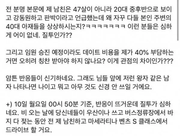 이 분위기는 나이 차이와 임원 승진 얘기를 넘어서 우리 마음에도 남아 있어, 특히 데이트 비용 이야기도 계속 머릿속에 남아 있지. 끝이 어떻게 흘러가든 간에 누가 옳다 그르다 단정하기는 어렵겠지. 그래도 계속 지켜보는 우리 생각만은 이리저리 흔들리는 중이야.