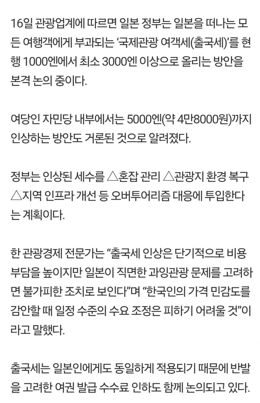 일본이 외국인 출국세를 올리는 방안을 검토한다는 소식이 다시 돌고 있어. 현행 1000엔에서 최소 3000엔 이상으로 올리고, 여당 내에서는 5000엔까지 거론된다는 말도 들려. 오버투어리즘 관리가 이유라는 설명인데, 가격이 비싸지면 수요가 어떻게 달라질지 보는 눈들이 많아. 한국인 여행시장에 미치는 타격을 조심스럽게 예의주시하는 분위기야.