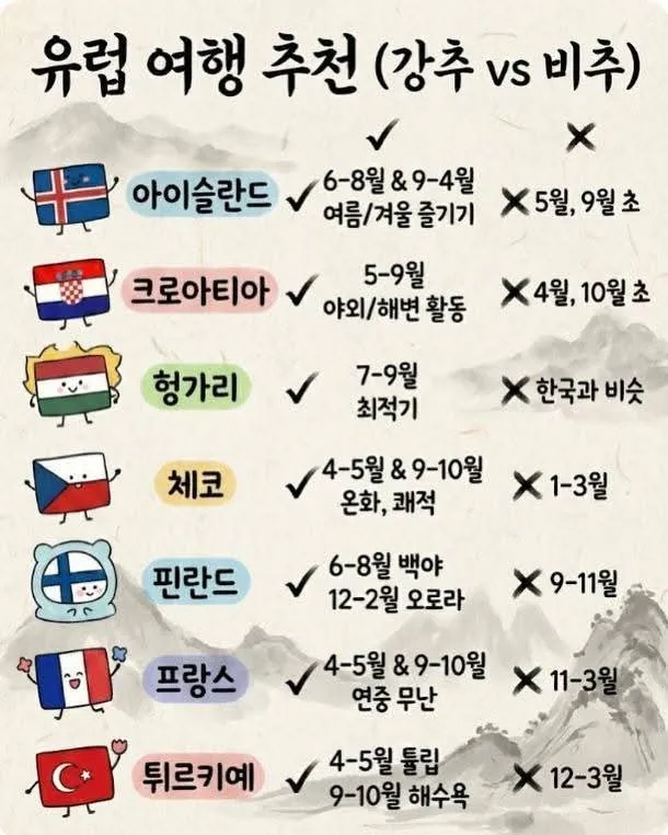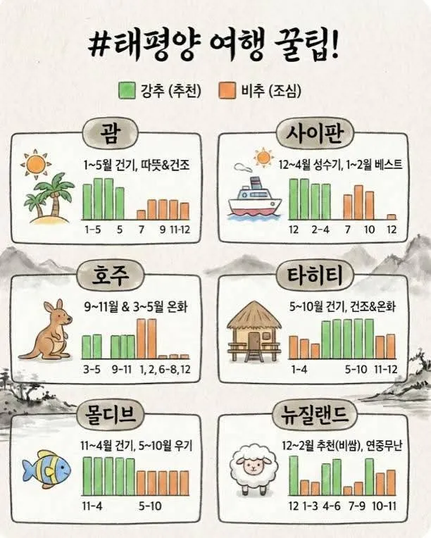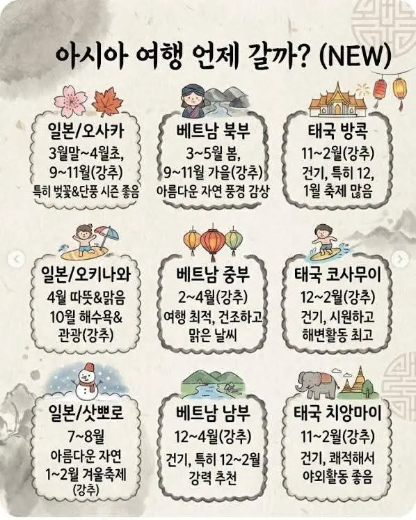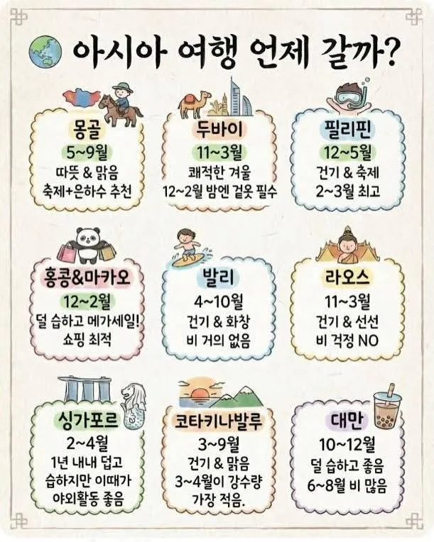 요즘 해외여행 계획 세우다가 달력에 적힌 건기와 강추 기간 사이에서 머리가 복잡해. 한두 달 사이에 어디를 가야 하나 고민하는 게 습관처럼 자리 잡았고, 같은 계절인데도 분위기가 천차만별이라 더 헷갈려. 날씨 표를 보면 건기다 좋다, 비가 덜 와야 한다는 말은 흔하지만 실제로는 사람들 마음이 다르게 움직이는 게 느껴져.