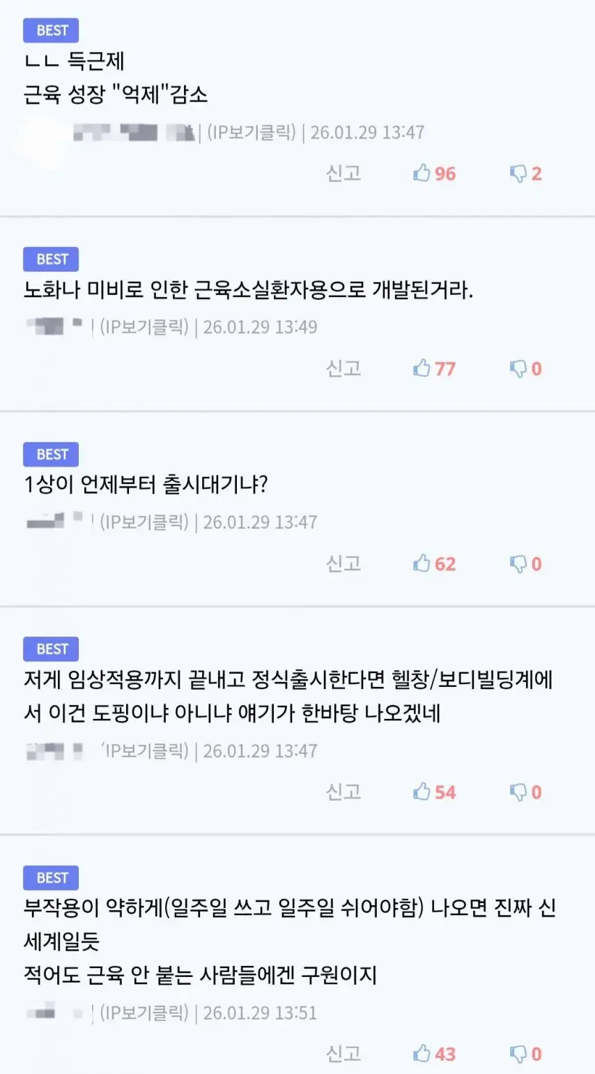 헬창이나 보디빌더들 사이에선 이 약이 나오면 어떤 보너스 효과가 생길지에 대해 상상하는 목소리가 커졌어. 근육 증가에 따른 몸매 변화가 빠를지, 아니면 부작용이 먼저 남길지에 대한 우려도 함께 퍼져 나가고 있지. 임상 단계가 진행될수록 경쟁사들도 비슷한 방향으로 움직일지 모른다며, 이게 진짜 신세계가 될지, 아니면 또 다른 의존성 문제를 남길지 궁금하다고들 해.