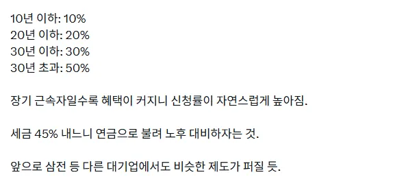 회사 쪽 말도 들어보니 장기적으로 이득일 수 있다나 봐, 근데 확실한 건 아직 아무도 모르는 거 같아. 연봉 8천 정도면 10년, 20년 묶으면 절감 폭이 커진다던데, 실제로는 숫자 확인이 필요해 보이더라. 근로소득세 대신 퇴직소득세가 적용된다던 이야기도 있어, 그 차이가 생각보다 크다고 들려. 근속 연수 따라 적립 비율이 달라진다니 오래 다닌 사람들 쪽으로 이점이 쏠리는 게 아닌가 싶은 의심도 생겨.